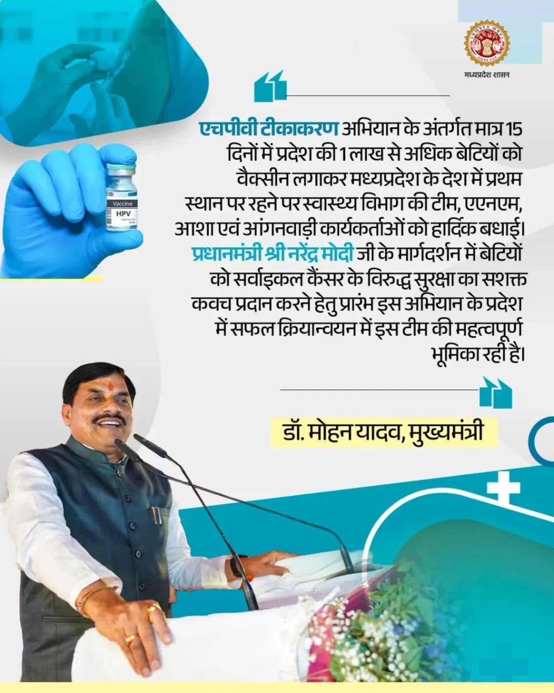 मुख्यमंत्री डॉ. यादव ने एचपीवी टीकाकरण अभियान में प्रदेश के देश में प्रथम रहने पर स्वास्थ्य विभाग की टीम को दी बधाई